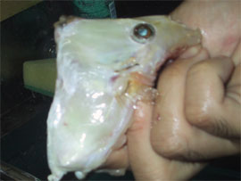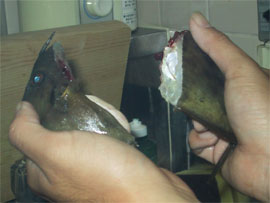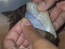 皮をむいたら、せびれ、腹びれを手で毟ります。あとは普通の魚のように三枚に下ろして、カッタイ小骨を毛抜きで抜き、薄く切ります。