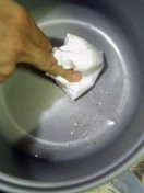 | タネを回収してチーズをいれてまたタネを入れます。 | 炊飯スイッチオン。ポーン。あれ、生だ。もう一丁!あれ生だ。 | お釜が小さいから火が通らないらしい。そんなときは電子レンジ。 | うおお、火花が!!!キケンキケン。 |