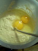 | お好み焼きの元を水で溶きます。 | 卵をぽちゃん。 | キャベツをザクザク。 | 豚肉とキャベツとタネをまぜまぜ。 |