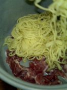 | お釜に油を塗りたくります。 | 安物の豚肉を敷きます。 | 焼きそば用の麺をほぐしつつ乗せます。 | タネを流し込みます。おっとチーズ入れるの忘れた。 |