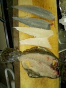 ヒラメはうろ覚えで五枚におろして皮をひきお刺身に。やり方があっているのかナゾ。一匹やったら疲れたのであとの二匹は鱗と内臓だけとって保留。