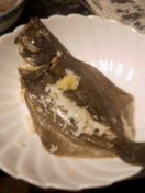 | ヒラメの刺身。盛りつけがアバウト。 | ヒラメの酒蒸し。レンジでチーン。 | ホウボウ。扇子は食べません。 |