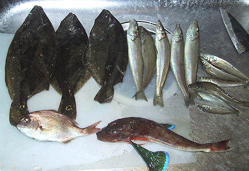1人あたりスミイカ1パイ、ヒラメ1.5匹、シロギス5匹、メゴチ7匹、ホウボウ 0.5匹、タイ0.5匹、イイダコ0.5匹。