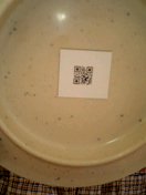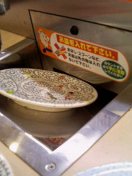 | この穴にお皿をいれる。 | ガシャン。穴の中に小さな皿洗いの人がいるはずだ。 | 皿の裏にはバーコード。これで何周レーンを回ったのか管理しているそうだ。 |