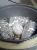 | 大量のシイタケを投入。 | ついでににんじん。 | アルミホイルで包む。 | 一緒に炊飯ジャーへ。 |