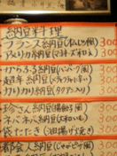 しかし、この店はメニューが多いな。いつもいっている「和かさ」の五倍くらいあってメニュー選びが大変たのしいぞ。納豆系だけで20種類くらいあるし。とりあえず、カロリー計算はせずに目に付いた美味しそうなメニューを注文しよう。