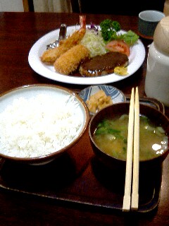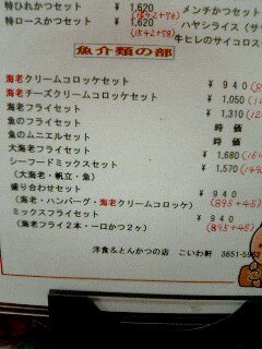 こぎれいな店内に入り、メニューを確認。とんかつやハンバーグなどの子供の頃からの好物が並んだメニューはなんとなく幸せな文字の羅列。体脂肪率アップを気にせずロースとんかつセットにしようかと思ったけれど、以前にほか弁屋で、「豚カツ弁当」を「ブタカツ弁当」と読んで恥をかいたトラウマがあるので(この店は平仮名だが)、一日一魚人生なので魚のフライセットでも頼もうかと思ったが、魚のフライのくせに「時価」とか書いてあって怖くて頼めない。なんの魚だよ。ふぐか。