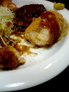 まず、海老クリームコロッケにソースをぶっかけて箸で切って一口。おうクリーミー。そういえば、冷凍食品でないクリームコロッケというものを生まれて初めて食べたかもしれない。このコロッケが冷凍でないという保証はないのだが。しかも蟹じゃなくて海老。美味しい。ハンバーグはどうかなと。お、なんかお皿がくるくる回るな。どんな皿だ。負けずにパクリ。うん、ハンバーグだ。海老フライも海老フライ。