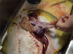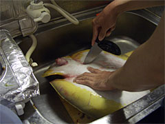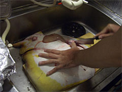 | 内臓を引きずり出す。 | エイの三枚おろし。 |