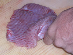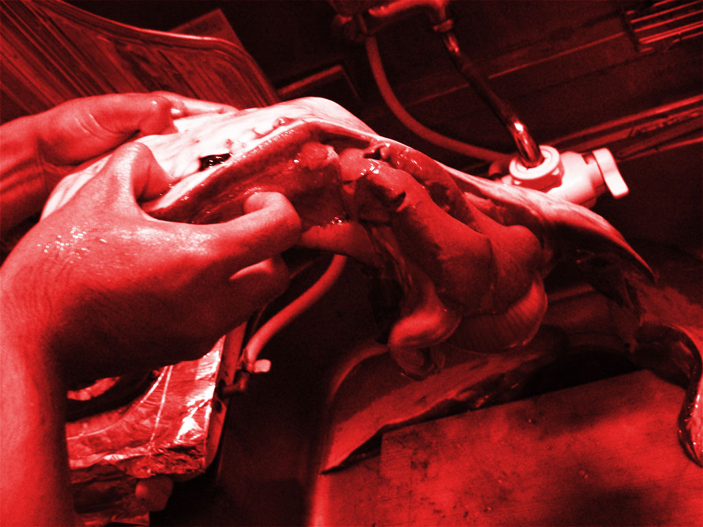 捌き方は、左右の鰭と胴体を切り離すところまではなんとなくわかった。とりあえず鰭を落とそうと裏側から尻尾近くに包丁を入れると、切断した尻尾のところから発情期の犬の○○○のようなイチモツが飛び出てきてちょっと焦る。それにめげずに胴体の堅いところに沿って包丁を進めると、今度はアンキモみたいな肝臓がはみ出てきた。負けない。そのままザクザクと鰭を切断して、切り口から内臓をすべて引っ張り出す。よくいわれるようなアンモニア臭さは全くない。新鮮な魚を捌いているのと変わらない魚のニオイがするだけだ。ただ、プリプリの内臓はパンクバンドにおける豚の臓物状態。魚を捌くのに多少慣れている私でもちょっと腰が引ける。嗅覚よりも視覚に訴えてくる食材だ。