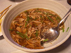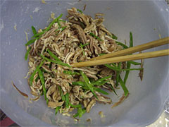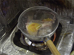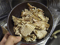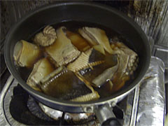 | 細かくほぐしてサヤエンドウと和える。チンジャオロースならぬ珍獣ロースか。 | アラを入れたゼラチン状の煮汁を温める。 |