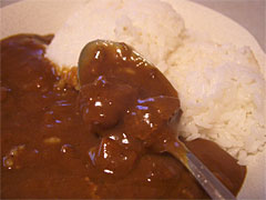 で、味。なかなかボリュームもあるし、確かにキンメダイの味がする。キンメダイの煮付けに、醤油の代わりにカレー粉いれてみましたっていう感じだ。そのままだ。煮込みすぎたためか具は見あたらないけれど、キンメダイがカレーに合う、合わないというのはおいておいて、結構キンメダイエキスが効いている。そして、なんていったって結局はカレーなのでおいしい。