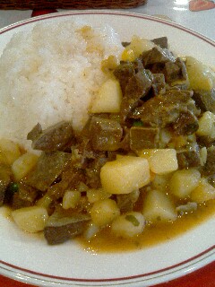 夏休みっぽい入れ物に入った水道水を飲みながら待つことしばし、お皿にこんもりと盛られたご飯に牛肉とジャガイモの角切りとミックスベジタブル(ニンジン、コーン、グリンピース)を煮込んだのがかかったヤツが登場。見た目は大丈夫そうだなと。
