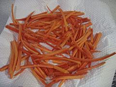 続けて人参。京人参堅い。包丁で切り刻んでキッチンペーパーで水気をとってみる。漬け汁は、一般的には酒と醤油とみりんを同量いれて煮きったものらしいけれど、酒のつまみなので酒多め。醤油1,酒3,蜂蜜少々,生姜ひとかけら。以上、すべて目分量、フィーリング、妄想で。