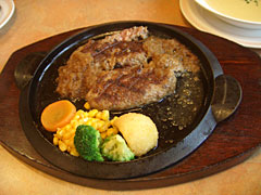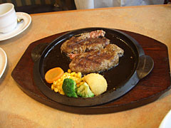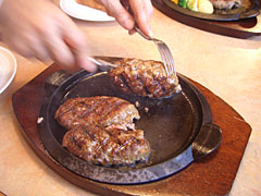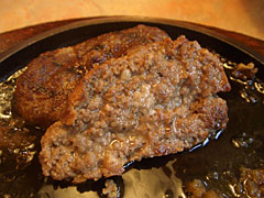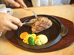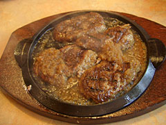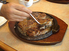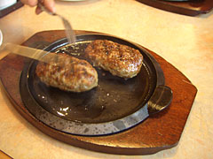 そして登場、爆弾ハンバーグ。あれ、メニューとかで見た写真だと、一人前で2枚のはずだけれど、運ばれてきたのは俵型(自称フットボール型)の肉の固まりが一つ。新年早々哀しいよう。哀しくて写真取り忘れた。おおっと、涙が溢れそうになったところで、店員さんが意外な行動に!。俵型のハンバーグをナイフで真っ二つ。ハンバーグが半分でグーだ!。そしてまだレアのハンバーグをフォークで鉄板に押しつける!。うおう、肉汁が飛び散るぜ。ブヒブヒ。そして仕上げに和風ソースをタップリかける。なんかウェイターさんが自慢げだ。うおおうおおう、迷惑なくらいソースが飛び散ってくる。ふと気がつけば写真とまあだいたい同じハンバーグが目の前に!。ガッテンガッテン。爆弾というか川に投げたネズミ花火っぽかったけれど。