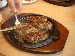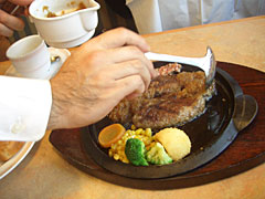 そしてもう一つのハンバーグが登場。そう、今の爆弾ハンバーグは同行者のハンバーグで私の爆弾ではない。私の爆弾はダブル爆弾400g、正月から太る気満々。いや、そんなことはないんですが。ダブル爆弾は付け合わせ一切なし。肉のみ。ううん。まあわかっていて注文したんだけれど、実物を見るとちょっと困る。肉肉肉。今度はウェイターさんが、なにもいわなくてもカメラのシャッター待ちをしてくれた。ああなんかハズカシイ。
