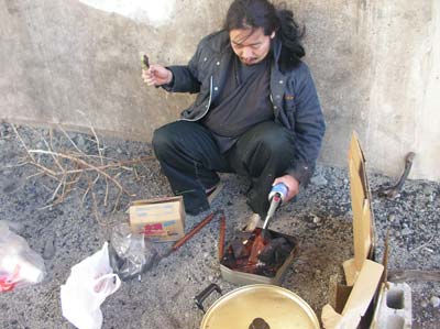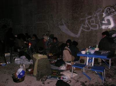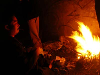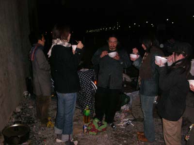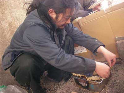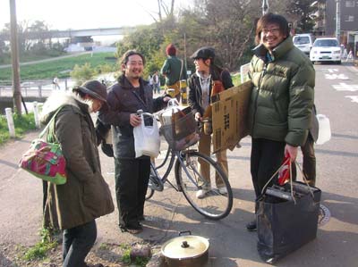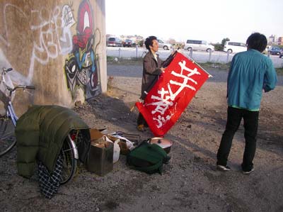 | 仕方なく移動します。河原でたき火をしてはいけないなんて、東京は寂しいところだねえ。 |