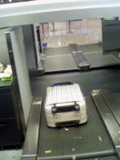 ハアハア息を切らしながら手荷物検査へ進む。金属類を全部ポケットから出してカゴに乗せベルトコンベアへ。フラフラしながらゲートをくぐると、ブーとエレベーターに乗った太った人みたいな音が鳴り、当然のように係のお姉ちゃんに捕まる。急いでいるのに〜。