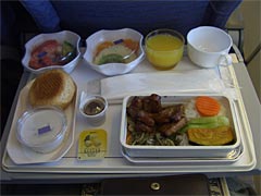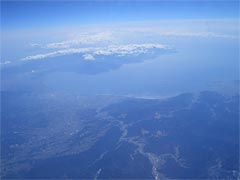 数分後、やっとのことでハトバスタイムが終了。ゴーというエンジン音と共に加速するヤマト、じゃなかったボーイング747。長い直線を一気に駆け抜け、空をめがけて機首をあげる。って別にボクが運転している訳ではないのだが。機内が斜めに持ち上がり、エレベーターが上がるみたいな感じでヒューンと離陸。ウオーと観客(旅客)の歓声爆発。窓の外を見れば、本当にお空を飛んでいる私。ふぉう。数分後、審判(スッチー)からシートベルト外してオーケーのアナウンス。1対0で日本代表勝利!って感じ。なにに勝ったのかよくわからんが。