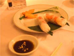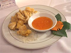 | ベトナムといえばとりあえず生春巻き。ライスペーパーにライスヌードルが詰まっていた。おにぎりの具がセンベイって感じの組み合わせ。 | イカを揚げた物。甘いソースをつけて食べるととっても美味しい。素敵。 |