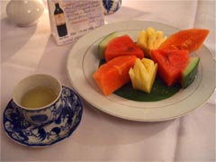 | 豆腐と肉団子のスープ、魚の煮物、白米と、日本食とあんまりかわらないメニューもあり。インディカ米だけど。 | ベトナムといえばフルーツ。スイカにパインにマンゴー。普通だ。お茶はジャスミンティーで美味しい。 |