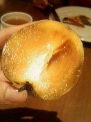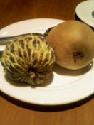 | 謎のフルーツ。 | 右。完熟の柿と梨を混ぜっぱなしにした感じ。強烈に甘い。 | 種盛りだくさん。フカフカしている。やっぱり甘い。 | 口直しにヨーグルト食べたらさらに甘かった。 |