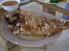 次々出てくる料理の中、さっき釣った魚らしき魚が丸揚げになってでてきた。あれ、釣った魚はまだ瓶の中でチャプチャプしている。っていうか料理させてくれるんじゃないの?あれあれあれとガイドさんに聞いてみると、「これは釣ったのと同じ魚です」とのこと。意味ねー。しかも鱗とらないで揚げられているし。ううん、釣った魚と釣ったのと同じ魚は、魯山人が使っていた杓文字と魯山人が使っていたのと同じ杓文字くらい違うのよ。ベトナム人に日本の釣り人の心伝わらず。