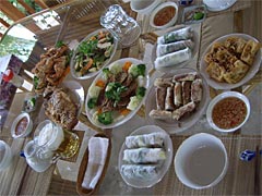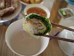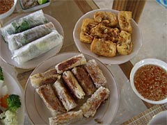 | 生春巻き、揚げ春巻き、厚揚げ。厚揚げは豆腐をあげたもので日本と同じ。普通に食べるらしいよ。 | 生春巻きは、ビーフンと香草がたっぷり。ニョクマムつけていただく。香草が強烈で素敵。もう雑草。 |