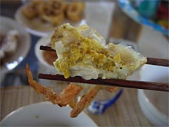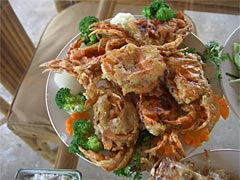 | 脱皮したばかりの柔らかい蟹の丸揚げ。ソフトシェルクラブとかいうやつ。一度食べてみたかったのでうれしい。 | 塩つけて食べる。テナガエビの唐揚げより柔らかい。ミソがウメー。 |