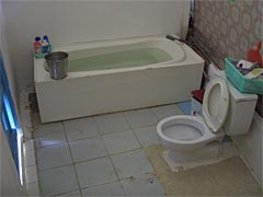 | ↑クリックすると拡大されます。アリ好きの方はどうぞ。 | トイレ。ユニットバスの振りをしているが、奧のバスタブは実はトイレを流すための水瓶だったりする。バケツでジャー。 |