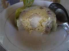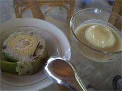 | ちまきとおしるこ。もちろん強烈に甘い。 | 油断して食べたら豚の脂身!。デザートに豚の脂身。この旅行で一番のカルチャーショック! |