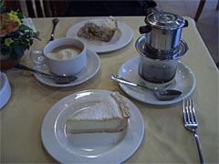 ドトールぐらいの値段設定に、ベトナムなのに高いなあと観光地価格にニホンゴで文句をいいつつ、ミルク入りのベトナムコーヒーとベイクドチーズケーキを注文。同行者は紅茶とアップルパイ。