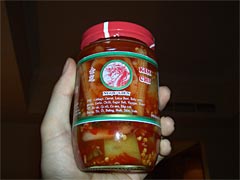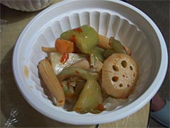 | デパートで買った自称キムチ。 | レンコン、キュウリ、ニンジン、ヤングコーン、キャベツ。キムチというかピクルス。 |