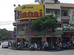 めざせフォーでさてどこだと市場をでてすぐに、Rinnaiの看板がデカデカとある建物の一階、2000年に開店したからか、はたまた一杯2000ドンだからかはしらないが、とにかくPHO 2000というピンクと緑の食べ物屋らしくない配色発見。知らなかったら電気屋の類と見間違える店構えだ。さすがベトナム、シズル感が溢れているぜ。