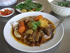 フォークに麺を絡めて、ビーフシチューをたっぷりつけてずるずるっといただく。ズルズル。フォークでフォーを食う。ベタベタ。うん、ビーフシチューが日本のファミレスあたりよりよっぽど美味しい。バインミーといい、このビーフシチューといい、ベトナムっていう国はヨーロッパ文化がところどころに隠し味のように存在するな。ただ、ビーフシチュー自体は肉も軟らかく野菜もしっかりしていて大変美味しいんだけれど、水っぽい米の麺と一緒に食べるとせっかくのシチューが水っぽくなってしまうので、やっぱり合わないなと。このシチューを昨日食べた美味しいパンと一緒に食べたいなあ。パクチーなしで。