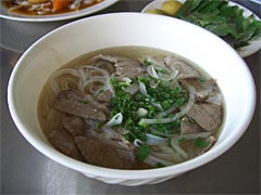 まず、同行人注文のフォー・ボーを、店員さんがニコッと持ってきた。ほほう、澄んだビーフスープに具は牛肉と青ネギのみのシンプル構成。富士そばでいう肉うどんですかね。さっぱり塩味チャーシューメンか。香草は別盛りでたっぷり。美味しうだなと。