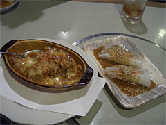 | チョリソーと和風サラダうどん。 | 唐揚げのグラタンみたいなやつと、ごまだれ生春巻き。 |