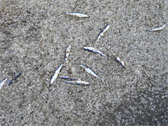 | サメの死体。釣ったら食えよ。 | 漁船近くに降り積もる鱗。積鱗5ミリを観測。 |