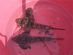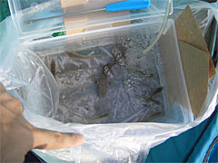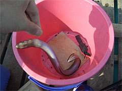 | アナゴを釣ってご満悦の板前。でもマアナゴじゃないと文句をたれる。 | ハゼが丸飲みされちゃった。 |