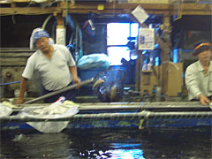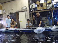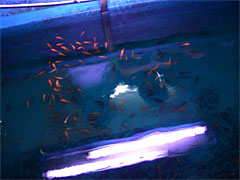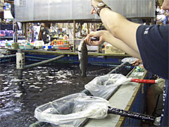 | 謎のサインが飾ってある。店名といいラーメン屋みたいだな。 | 釣れなくなると魚が補充されます。ぼちゃん。 |