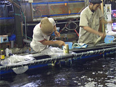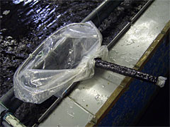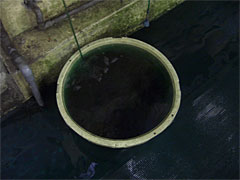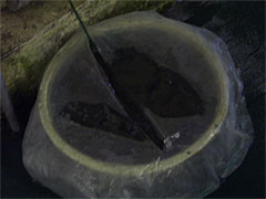 | 釣れたら漬け物樽へ。でも浅いから逃げられます。 | そんなときは、この怪しい蓋をしよう。 |