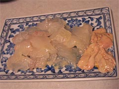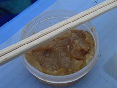 | 船上の肝合え。身が甘い。 | これはお家でつくった刺身。全部でこれだけ。寿司を作る気にもならない。 |