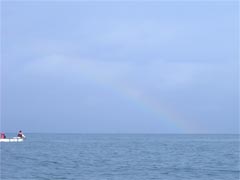 2mがアジとスズメダイをバタバタと釣り上げている間、わたしはベラとキタマクラと格闘。ああ、エサが一瞬でなくなるよう。どういうこったい富浦湾と空を見上げると、雨が上がってお日さまが出てきた。そして海の向こうには大きな大きな虹がでている。ああ、あの虹みたいにこの竿も曲がらないかなあと思ったところでタイミング良くカワハギが釣れだした。ちょっと小さいけど。アジを釣っていた2mは、スズメダイがいっぱい集まり過ぎて釣りというか餌付けみたいになっている。でもなんか楽しそうだ。