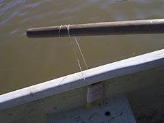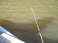 川が濁ってワカサギが釣れない。そんな時は、濁った川で釣れる魚を釣ればいい。濁った川といえば、エレファントフィッシュ、じゃなくてウナギ釣り。いや、湖なんだけれど。ということで、釣れたワカサギをつけた針を放り込んでみる。糸はタコ糸、竿はオール、エサはワカサギ。