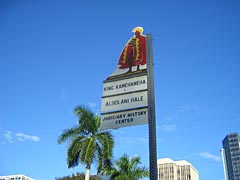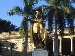 「では、これからハメハメハ大王の銅像がある公園に行きますので、15分間写真とかとってくださいね」。はあ。ハメハメハですか。ハメハメハっていうと南の島の大王で、その名も偉大なハメハメハですね。確かロマンチックな王様で風のすべてが彼の歌、星のすべてが彼の夢だと小学校の運動会で習ったような。銅像見物って上野の西郷さん以来だな。別に見物しようと思って見た訳でもないけど。確か伊豆にもお宮と松とかいうのがあった気がする。まあいいや、とりあえず外の空気が吸える。しかしハメハメハか。