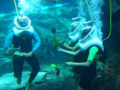 まず入り口近くにある、円柱状の水槽の周りを螺旋階段状におりていく。この水槽はアカエイやアカエイやアカエイがユラユラ泳いでいて、他にもすぐそこの海で捕まえてきたような魚が生け簀料理店のように鼻先をボコボコにしながら泳いでいた。魚が泳ぐデカイ水槽というのはそれだけで楽しいなと、アワビのようにガラスに張り付いて動かなくなる私。ところでこの水槽ではプレデターみたいな格好で餌付け体験ができる。うーんどうでしょう。