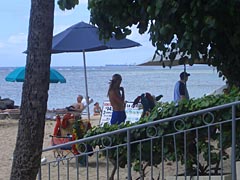 ワイキキ辺りのホテルにある、すぐそこがビーチという海の家みたいな立地条件のレストランへ這々の体でたどり着き、やっとこご飯にありつく。団体さんなのでメニューに選択の余地なし。まずでてきたのが、グァバジュースとアンチョビが乗った白菜みたいな葉っぱ。で、メインが焼いた中華麺の固まりに魚とブロッコリーの餡をかけたもの。海の家と言えば焼きそばだよね。お味はというと、美味しかったような、美味しくはないような、美味しくなる余地があったような。最後にデザート、ココナッツアイスクリーム。白い四角いのを杏仁豆腐だと思って油断して食べたら、当然のようにココナッツミルクの固まりだった。そうか、ここはハワイなんだった。ココナッツクラッシュの島なのだ。![]() |