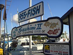 お金を払ったらレッツゴー。ちなみに金額は申し込んだ代理店によって数ドル違ったりする。乗り込む船の名前は「Sashimi II」。いや、本当だって。さすがに屋形船でも日本の釣り船でもないクルーザータイプの船でちょっとガッカリ。出船前にサングラスをかけた本田美奈子に浅野ゆう子が乗り移ったみたいな押しの強いねえちゃんがいきなり演説を始める。「あんまり釣りに夢中になるのは日本人の悪いところね。せっかくお金を出しているんだから、夜景を見たりしてエンジョイしないと損よ!、アメリカ人はお金を払ったらその分楽しむわ」とまくしたてるあなたは日本人。要約すると「釣れなくても文句言うな」という事らしい。なんかイヤな予感がメラメラとしてきた。