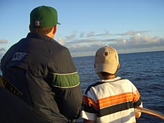 ガクガク震えながら丸まっていると、ケインが海の向こうを指さして「クジラ!」とホエール。なんだなんだと見に行くと、海面が少しに波立っているように見える箇所があるような気もする。クジラなのかな。するとすぐに厚着をしたクジラ好きっぽいアメリカン親子が現れて、船先頭のタイタニックスポットでホエールホエールゴーゴーホエール。期待に応えるように遠くの方で潮を吹くクジラさん。釣ったらごめんね。ほら、日本人だし。