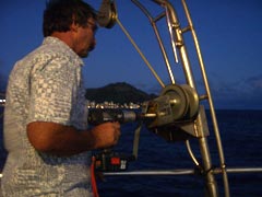 | 釣れた。ハワイネオンイサキと名付けよう。 | パラシュートアンカーをドリルで巻き取る晃。 |